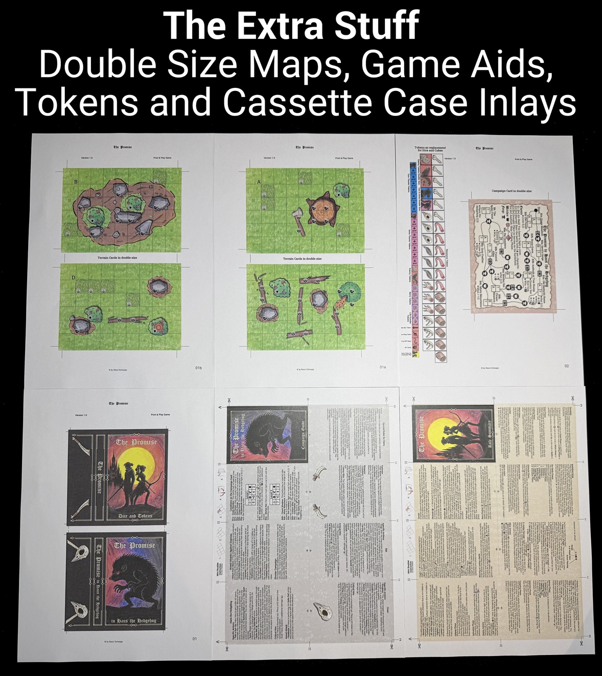 - Kompakt: Drucke 18 Karten und ein paar Marker aus; zusätzlich werden nur sechs 6-seitige Würfel (12 mm) benötigt.